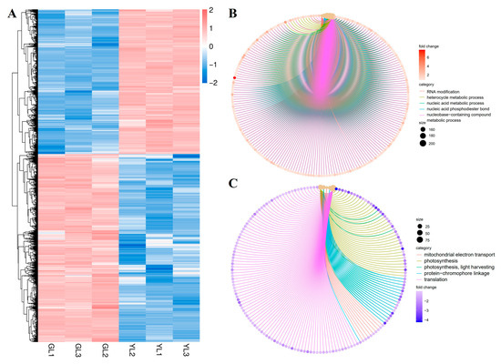 A total of 9637 DEGs (|fold change| ≥ 2, FDR < 0.01) were identified between the GL and YL samples: 4192 were upregulated and 5445 were downregulated in YLs versus GLs (Figure 4A). Analysis of gene ontology (GO) biological process terms revealed that the upregulated genes were enriched in “RNA modification”, “heterocycle metabolic process”, “nucleic acid metabolic process”, “nucleic acid phosphodiester bond hydrolysis”, and “nucleobase-containing compound metabolic process” (Figure 4B), whereas the downregulated genes were enriched in “mitochondrial electron transport, ubiquinol to cytochrome”, “photosynthesis”, “photosynthesis, light harvesting”, “protein-chromophore linkage”, and “translation” (Figure 4C). These results suggest that nucleic acid metabolism and photosynthesis were markedly altered in the albino leaves at the transcriptional level.