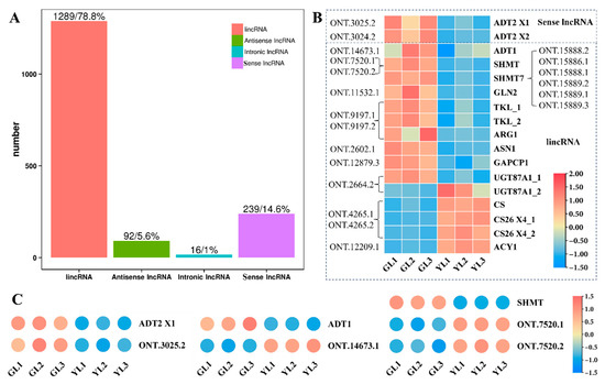 Analysis of lncRNAs and their predicted DEG targets associated with the KEGG pathway “biosynthesis of amino acids”. (A) The numbers of different types of lncRNA obtained in C. sinensis leaves. (B) lncRNAs and their predicted DEG targets associated with the “biosynthesis of amino acids” KEGG pathway. (C) The relative expression of ADT2 X1, ADT1, SHMT, and their predicted cognate lncRNAs as measured by qRT–PCR.