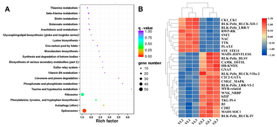 Analysis of alternatively spliced transcription factor genes. (A) Top twenty enriched KEGG pathways of alternatively spliced transcription factor genes. (B) Expression heatmap of alternatively spliced transcription factor genes.
