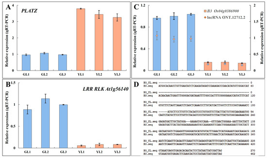 The expression levels and alternative sequences of three transcription factors that exhibited alternative splicing. (A,B) The relative expression levels of PLATZ (A) and LRR RLK At1g56140 (B) as measured by qRT–PCR. (C) The relative expression levels of B3 Os04g0386900 and the lncRNA ONT.12712.2. (D) The alternatively spliced sequence of B3 Os04g0386900 in the YLs.