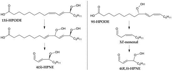 - Schneider, C.; Tallman, K.A.; Porter, N.A.; Brash, A.R. Two Distinct Pathways of Formation of 4-Hydroxynonenal. J. Biol. Chem. 2001, 276, 20831–20838. [Google Scholar] [CrossRef]