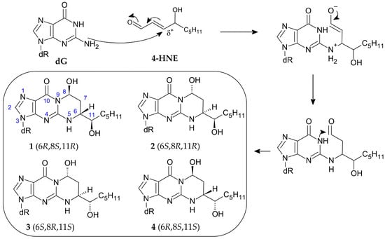 - Huang, H.; Wang, H.; Qi, N.; Kozekova, A.; Rizzo, C.J.; Stone, M.P. Rearrangement of the (6S,8R,11S) and (6R,8S,11R) Exocyclic 1,N2-Deoxyguanosine Adducts of trans-4-Hydroxynonenal to N2-Deoxyguanosine Cyclic Hemiacetal Adducts When Placed Complementary to Cytosine in Duplex DNA. J. Am. Chem. Soc. 2008, 130, 10898–10906. [Google Scholar] [CrossRef] [PubMed]
