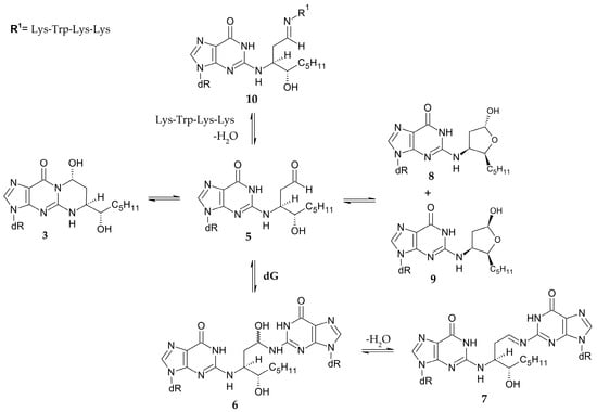- Kurtz, A.J.; Lloyd, R.S. 1,N2-Deoxyguanosine Adducts of Acrolein, Crotonaldehyde, and trans-4-Hydroxynonenal Cross-link to Peptides via Schiff Base Linkage. J. Biol. Chem. 2003, 278, 5970–5976. [Google Scholar] [CrossRef]