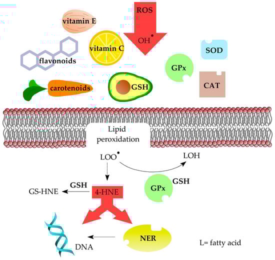- Feng, Z.; Hu, W.; Tang, M.-S. Trans-4-hydroxy-2-nonenal inhibits nucleotide excision repair in human cells: A possible mechanism for lipid peroxidation-induced carcinogenesis. Proc. Natl. Acad. Sci. USA 2004, 101, 8598–8602. [Google Scholar] [CrossRef]
