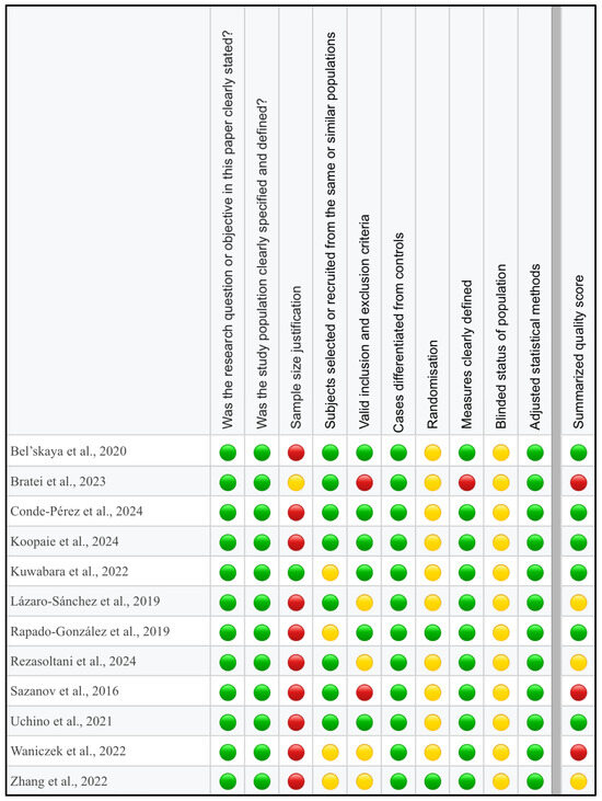 The ‘Study Quality Assessment Tool’ issued by the National Heart, Lung, and Blood Institute, National Institute of Health was used to assess the risk of bias in each of the individual studies included in this review [57]. The questionnaires for every study were completed independently by two reviewers (S.K. and M.O.), with disagreements resolved through discussion and arbitration by a third reviewer (A.Z.). The summarized quality assessment for every single study is reported in Figure 2.