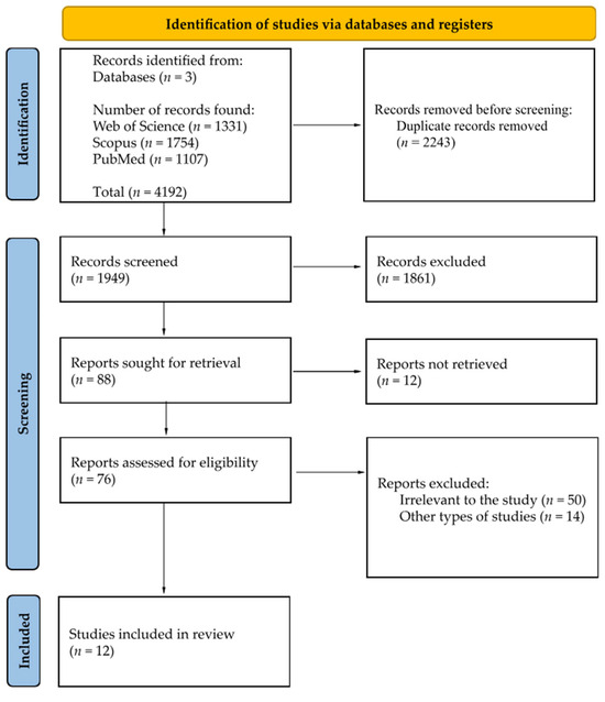 Out of 4192 publications, 13 were identified as meeting the specified inclusion and exclusion criteria. The literature review uncovered 4192 entries in the PubMed, Scopus and Web of Science databases, with the following records removed before screening: 2243 duplicate records removed. A total of 1949 papers were screened; 1861 records were excluded based on title; 12 reports out of 88 were not retrieved in full-text availability. Out of 76 remaining papers, 12 were manually chosen based on full-text analysis and included in this review paper (see Figure 3).