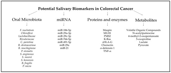 Potential salivary biomarkers in CRC [58,59,60,61,62,63,64,65,66,67,68,69].