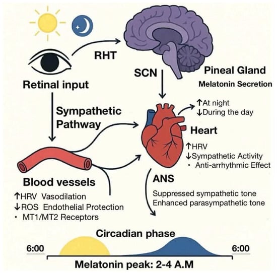Lifestyle and environmental factors also exert a strong modulatory influence on melatonin secretion. Nocturnal exposure to artificial light, especially blue-enriched light from electronic devices and light-emitting diode (LED) sources, suppresses endogenous melatonin release by interfering with the SCN-mediated sympathetic signaling to the pineal gland []. Moreover, irregular sleep–wake schedules, shift work, and insufficient exposure to natural daylight exacerbate circadian misalignment, leading to blunted melatonin rhythms and promoting circadian disruption []. These alterations are increasingly recognized as contributing factors in the pathogenesis of cardiovascular and metabolic diseases. An overview of the SCN–melatonin pathway and its influence on cardiovascular regulation is presented in Figure 1.