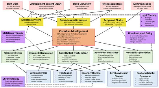 The cumulative effects of ALAN exposure, mistimed feeding, and chronic stress converge on a state of circadian disruption, often referred to as circadian disruption. This condition is characterized by a persistent misalignment between endogenous circadian rhythms and environmental or behavioral timing cues []. Circadian disruption affects a wide array of biological systems, including the ANS, metabolic pathways, and vascular function, thereby facilitating the development of cardiometabolic and cardiovascular disorders []. This disruption plays a pivotal role in the pathogenesis of hypertension, metabolic syndrome, and obesity, forming a mechanistic link between lifestyle patterns and long-term cardiovascular risk.