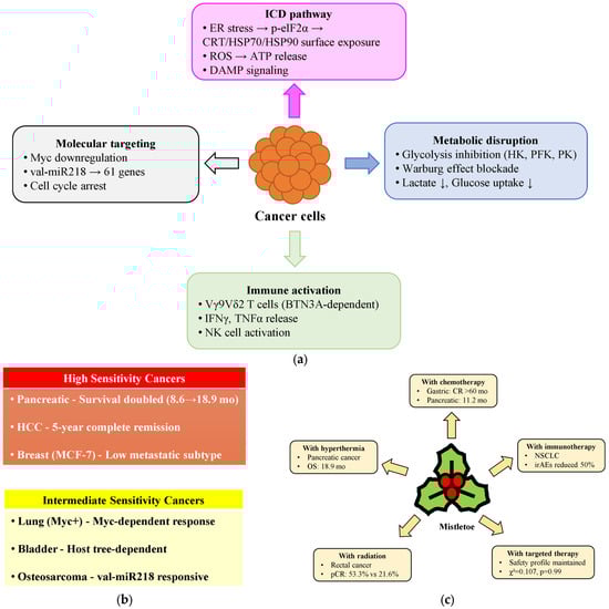 Molecular mechanisms and therapeutic applications of mistletoe in cancer treatment (2020–2025). (a) Four major pathways through which mistletoe affects cancer cells. (b) Stratification of cancer types by mistletoe sensitivity based on clinical responses. (c) Enhanced outcomes from combining mistletoe with conventional cancer therapies, showing specific benefits for each combination. BTN3A, butyrophilin 3A; CR, complete response; CRT, calreticulin; ER, endoplasmic reticulum; HCC, hepatocellular carcinoma; HK, hexokinase; HSP, heat shock protein; ICD, immunogenic cell death; irAEs, immune-related adverse events; NSCLC, non-small-cell lung cancer; OS, overall survival; pCR, pathologic complete response; PFK, phosphofructokinase; PK, pyruvate kinase.