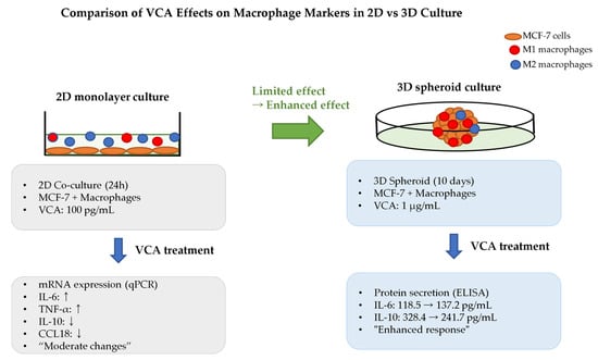 Comparison of VCA effects on macrophage polarization markers between 2D and 3D culture systems. Left panel shows 2D co-culture of MCF-7 cells with M1 or M2 macrophages treated with 100 pg/mL VCA for 24 h, measuring mRNA expression changes by qPCR. Right panel shows 3D spheroid co-culture treated with 1 μg/mL VCA for 10 days, measuring protein secretion by ELISA. The 3D culture system demonstrates enhanced cytokine modulation compared to 2D culture, with more pronounced changes in IL-6 (118.5 to 137.2 pg/mL in MCF-7+M1) and IL-10 (328.4 to 241.7 pg/mL in MCF-7+M2). Note the different measurement methods (mRNA vs. protein) and treatment conditions between the two systems. CCL18, C-C motif chemokine ligand 18; ELISA, enzyme-linked immunosorbent assay; IL, interleukin; M1, classically activated macrophage; M2, alternatively activated macrophage; qPCR, quantitative polymerase chain reaction; TNF-α, tumor necrosis factor-alpha; VCA, Viscum album var. coloratum agglutinin.