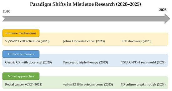Clinical translation has yielded compelling real-world evidence. The integration of mistletoe with checkpoint inhibitors has demonstrated favorable clinical outcomes [29,44,84], while maintaining excellent safety profiles across diverse combination therapies [63,86]. Figure 3 summarizes these transformative advances from 2020 to 2025, illustrating the progression from mechanistic discoveries to clinical implementation and novel therapeutic approaches. The Johns Hopkins trial’s establishment of intravenous protocols [43] marks a regulatory milestone, paving the way for broader implementation in Western oncology.