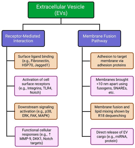 EVs interact with target cells through multiple mechanisms that modulate cellular function and physiology. A principal mechanism is receptor-mediated binding, in which EV surface proteins or ligands—such as fibronectin [], HSP70 [], or Jagged1 []—bind to corresponding receptors, including integrins, TLR4, and Notch, on target cells. These interactions can initiate signaling cascades such as p38 MAPK, ERK1/2, FAK, and Src family kinases, leading to gene expression changes, including upregulation of MMP-9, DKK1, and various Notch target genes []. In parallel, EVs can deliver cargo via direct membrane fusion. This energy-dependent process is typically mediated by specialized proteins, including SNAREs, Rab GTPases, and SM family proteins []. Fusion occurs when membranes approach within approximately 10 nm, driven by fusogenic or receptor–ligand interactions and regulated by membrane lipid composition [].