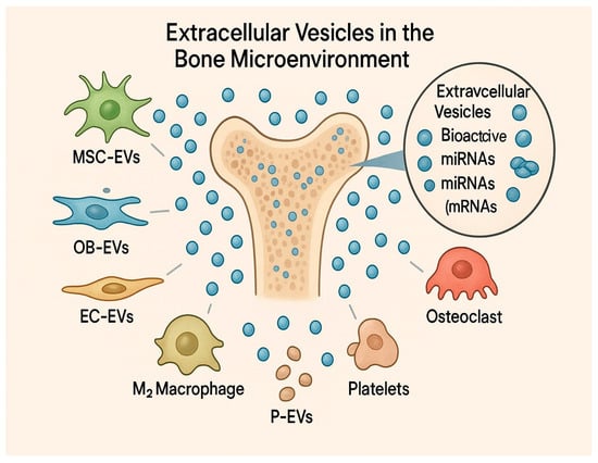 EVs, including exosomes and microvesicles, have emerged as pivotal mediators of intercellular communication within the bone microenvironment. Secreted by a wide range of cell types, these nanoscale vesicles carry bioactive cargo proteins, lipids, mRNAs, and regulatory miRNAs that orchestrate key cellular events in recipient cells. In skeletal tissue engineering, EVs represent a promising cell-free approach capable of recapitulating the regenerative effects of their parent cells []. Among EVs, those derived from mesenchymal stem cells (MSCs)—notably from bone marrow, adipose tissue, and dental pulp—are most extensively studied. MSC-derived EVs exhibit potent osteoinductive properties, mediated by cargo such as miR-21, miR-196a, miR-27a, and miR-206, which target inhibitors of osteogenic differentiation, including SMAD7 and DKK1 []. Bone marrow MSC-EVs (BM-MSC-EVs), for example, have been shown to induce osteoblast differentiation and enhance bone healing via activation of the Wnt/β-catenin and MAPK pathways, promoting mineral deposition and collagen matrix formation. Similarly, adipose-derived MSC-EVs (AD-MSC-EVs) support osteogenic differentiation and modulate the inflammatory microenvironment, facilitating the repair of osteoporotic or traumatic bone injuries []. Dental pulp MSC-EVs deliver angiogenic and neurotrophic cues in addition to osteogenic signals, potentially supporting neovascularized bone tissue engineering [].