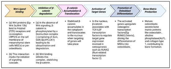 Wnt signaling initiates osteogenesis by ligand binding, which prevents β-catenin degradation, allowing its accumulation and nuclear translocation. β-catenin then activates target genes, promoting osteoblast differentiation and ultimately bone matrix production (Figure 3) [].