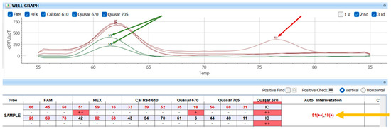 This example shows how the results are displayed in the Seegene Viewer during the analysis of an HPV-positive sample with co-infection. The graph at the top represents the fluorescence signals detected in the melting curve analysis, allowing the identification of HPV genotypes present in the sample. The curves are shown in red and green, and the presence of distinct peaks indicates a positive signal for specific HPV types. These peaks correspond to melting temperatures associated with individual genotypes. The detected HPV genotypes and their respective semi-quantitative viral loads, indicated by the number of “+” symbols, are listed in the table below. The automatically interpreted result is shown on the right, under “Auto Interpretation,” providing a quick and clear summary of the HPV types identified and their corresponding viral loads. Taking the selected example: in the graph, the two peaks corresponding to genotype 51 are highlighted in green, and the peak corresponding to genotype 18 is highlighted in red. The yellow line highlights the program’s auto-interpretation, namely 51++ and 18+, clearly showing that genotype 51 has a higher viral load compared to genotype 18, since it was detected twice in the sample.