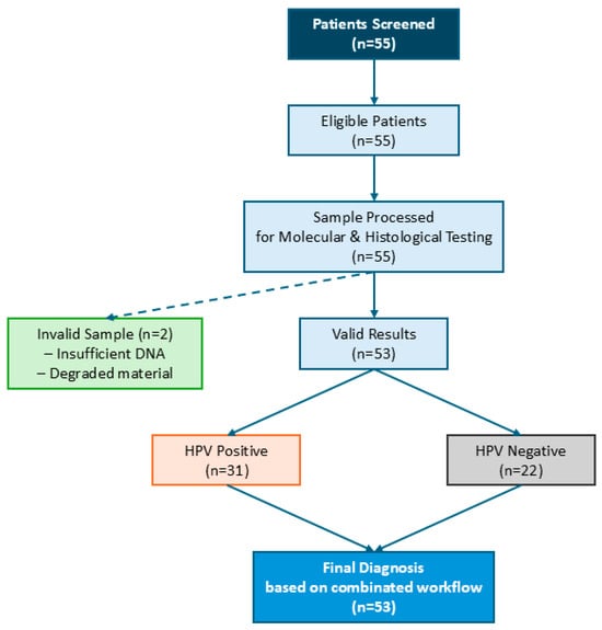 STARD Flowchart: Patient and Sample Workflow. This flowchart illustrates the patient and sample processing pathway in this study. A total of 55 patients were screened, and all were eligible for analysis. Of these, two samples were classified as invalid due to insufficient DNA or degraded material. The remaining 53 valid samples underwent molecular and histological testing. Among them, 31 tested positive for HPV DNA and 22 tested negative. The final diagnosis was determined based on the combined histopathological and molecular workflow, ensuring a comprehensive assessment of HPV presence and lesion severity.