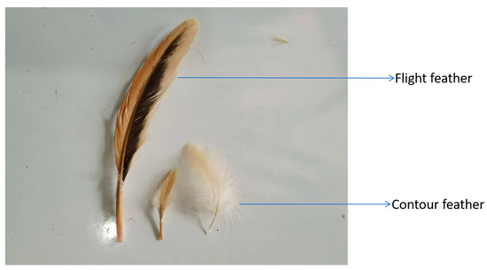 Feathers are the keratinized products of epidermal cell proliferation in birds. The feathers of domestic poultry exhibit a wide range of branching structures [5]. The branches of feathers originate during the initial phase of feather development, comprising three distinct levels: from the shafts to the barbs, from the barbs to the rachises, and from the rachises to the barbules or hooklets. The geometry of the components of the abdominal feathers was characterised using scanning electron microscopy, microcomputed tomography and imaging techniques. The feather was found to be divided into three zones: an outer zone (bard shafts and barbules), an inner zone (bard shafts and barbules), and a transition zone [6]. It is evident that, based on the periods of their morphological development, feathers can be classified into three distinct categories: downy feathers, contour feathers, and flight feathers (symmetrical contour feathers on both sides and bilateral asymmetrical flight feathers) (Figure 1) [7,8]. The function of feathers is determined by their type, and they play a primary role in thermoregulation, attracting mates, communication, flight, and skin protection [7,9,10].