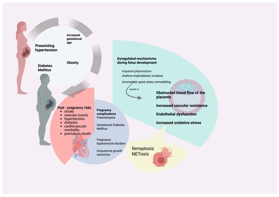 Recent insights from molecular and immunological research have identified two emerging processes—ferroptosis, a form of regulated, iron-dependent cell death characterized by lipid peroxidation [8], and NETosis, the formation of neutrophil extracellular traps (NETs) [9]—as novel contributors to cardiovascular pathology [10,11]. While their roles are increasingly recognized in non-pregnancy-related cardiovascular diseases, their impact during pregnancy remains poorly defined. Notably, excessive neutrophil activation and immune cell infiltration have been implicated in both GDM and PE, supporting an inflammatory axis that may drive disease progression [12]. Excessive ferroptosis is also linked to heightened systemic inflammation and impaired angiogenesis, further exacerbating cardiovascular risk in affected pregnancies highlighting the direct role of this type of cell death with significant cardiovascular risk [13].