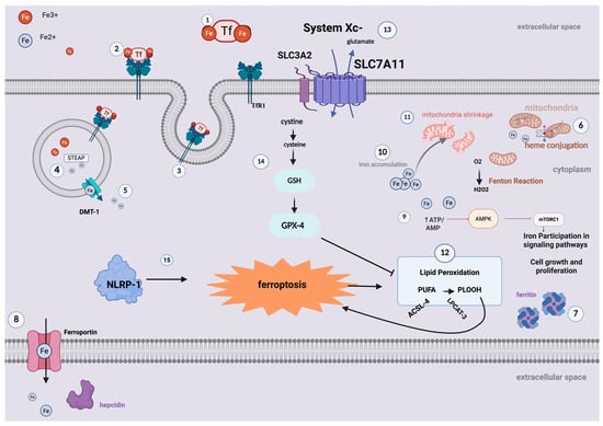 Molecular pathways of iron and shared pathways with ferroptosis. In this schematic illustration, we present iron absorption and molecular regulatory pathways that enhance or inhibit ferroptosis. Iron binds to circulating transferrin in its ferric state (1). Transferrin subsequently binds to transferrin receptors located on the cell membrane (2). The transferrin–transferrin receptor complex (mainly TfR1) is then endocytosed (3). In acidified endosomes within the cytoplasm, ferric iron (Fe3+) is converted to the ferrous state (Fe2+) (4) and is released into the cytoplasm via the divalent metal transporter 1 (DMT-1) (5). Iron participates in several cellular metabolic pathways, including heme synthesis in the mitochondria (6). It can also be stored in ferritin to prevent accumulation or degradation that may trigger oxidative stress (7). Iron can exit the cytoplasm via Ferroportin, which is located on the cell membrane (8). Hepcidin binds to Ferroportin with high affinity and specificity, thereby inhibiting iron export from the cell. Iron also directly participates in signaling pathways such as AMPK/mTOR (9). Ferroptosis is driven by iron accumulation (10) and leads to organelle damage (11), lipid peroxidation (12), and ultimately cell death. Lipid peroxidation is mediated by ACSL-4 and LPCAT-3, leading to the production and accumulation of phospholipid hydroperoxides (PLOOH) through the breakdown of bonds in polyunsaturated fatty acids (PUFAs), thereby enhancing ferroptosis (12). System Xc−, composed of two subunits (SLC3A2 and SLC7A11), acts as a glutamate/cystine antiporter (13). Once inside the cell, cystine is converted to glutathione (GSH), and glutathione peroxidase-4 (GPX-4) inhibits lipid peroxidation (14) and, ultimately, ferroptosis. NLRP-1 activation further enhances ferroptosis (15). (This illustration was created using the icon library of https://app.biorender.com/).