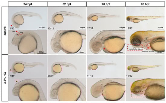 Early morphological analysis of zebrafish exposed to high glucose. Bright-field microscopy revealed systemic phenotypic alterations in zebrafish embryos exposed to high glucose across developmental stages, with cranial magnification to evaluate glucose-induced malformations in early brain regional development (N = 12). The midbrain–hindbrain boundary (the developmental boundary separating the midbrain and hindbrain regions) is demarcated by red arrows; cardiac tissue (the developing heart and pericardium) is labeled with asterisks; the mandibular region (the region that will form the jaws) is outlined by a rectangular box. MB: midbrain; MHB: midhindbrain; HB: hindbrain.