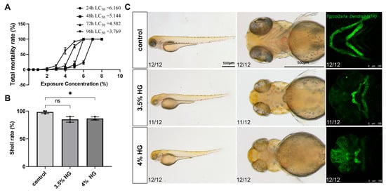 Following high glucose treatment, the total mortality rates were statistically analyzed at 24 hpf, 48 hpf, 72 hpf, and 96 hpf. The results demonstrated that the LC50 values at 24, 48, 72, and 96 hpf were 6.16%, 5.144%, 4.582%, and 3.769%, respectively. Consequently, glucose concentrations of 3.5% and 4% were selected as experimental concentrations (Figure 2A). Chronic exposure from 10–80 hpf induced significant craniofacial abnormalities, including pharyngeal arch cartilage malformations, Meckel’s cartilage defects, and ceratohyal deformities, as confirmed by fluorescent imaging (Figure 2C). Additionally, the hatching rate of zebrafish embryos progressively decreased with increasing glucose concentrations (Figure 2B).