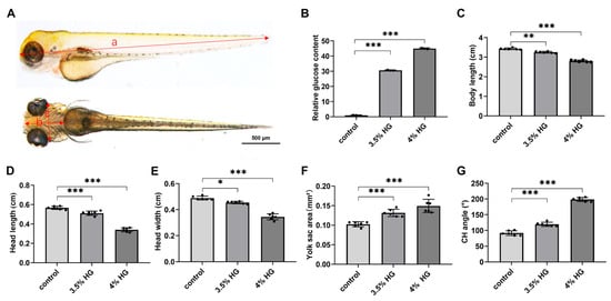 Morphological statistics of craniofacial cartilage of zebrafish exposed to high glucose. (A) Standard measurement criteria for zebrafish embryos. a: body length; b: head length; c: head width. (B) Relative glucose content at 80 hpf in control and high glucose exposure groups. (C–G) Morphometric parameters of zebrafish embryos exposed to high glucose at 80 hpf: body length (C), head length (D), head width (E), yolk sac area (F), and CH angle (G). N = 12. Data are presented as mean ± SEM; * p < 0.05, ** p < 0.01, *** p < 0.001.