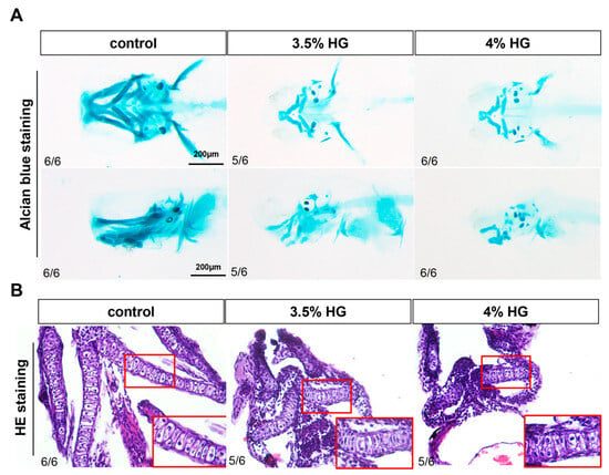 Embryos at 80 hpf were collected and fixed in 4% paraformaldehyde (PFA) at 4 °C for 36 h. Subsequently, the embryos were treated with 1 mL of bleaching solution (composed of 1.5% H2O2 and 1% KOH) for 20 min to remove skin pigments. The bleaching solution was then washed off with distilled deionized water (ddH2O for 1 h) until complete sedimentation. The embryos were then transferred to 1 mL of Alcian blue staining solution (1 mg Alcian blue dye, 8 mL absolute ethanol, 2 mL glacial acetic acid) and incubated in the dark with shaking for 48 h. Following staining, a graded ethanol dehydration series (95%, 90%, 40%, and 15%) was performed, with each step lasting 2 h. The embryos were then rinsed with ddH2O for 2 h. Next, the embryos were treated with 1 mL Proteinase K (1:1000) digestion buffer and placed in a 37 °C incubator to facilitate the digestion of muscle and epidermal tissues. The digestion progress was monitored periodically until the zebrafish cartilage structures became clearly visible under macroscopic observation. The digestion buffer was replaced with 0.5% KOH for two washes (20 min each), followed by sequential treatment with 0.375%, 0.25%, and 0.125% KOH-glycerol solutions under gentle shaking. Finally, the embryos were preserved in pure glycerol for photography.