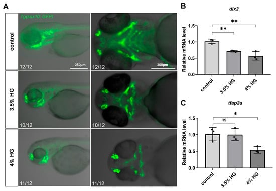 Craniofacial malformations represent one of the most common congenital anomalies globally, comprising more than one-third of all birth defects [,]. Importantly, numerous critical genes implicated in craniofacial development exhibit remarkable conservation between zebrafish and humans [,]. In zebrafish, craniofacial cartilage is primarily formed by CNCCs, which rapidly migrate and subsequent differentiate into craniofacial structures [,]. The development of pharyngeal arch cartilage in zebrafish is inseparable from the normal migration of neural crest cells [,]. Dlx2, a mammalian homolog of the distal-less homeobox gene family, exhibits predominant expression in the mandibular process []. Genetic alterations in dlx2 impair CNCCs migration, proliferation, and differentiation, consequently disrupting normal skeletogenesis [,]. Similarly, tfap2a demonstrates stage-specific expression throughout NCC development and plays pivotal roles in NCC specification, particularly in regulating CNCCs migration, proliferation, and survival during vertebrate craniofacial morphogenesis []. Our investigation revealed significant transcriptional downregulation of both dlx2 and tfap2a, indicating their potential involvement in mediating abnormal NCC proliferation and differentiation patterns in zebrafish embryos. To specifically examine high glucose’s impact on early CNCCs migration, we employed Tg(sox10:GFP) transgenic zebrafish at 24 hpf. Additionally, PCNA antibody staining was also conducted on zebrafish pharyngeal arches at 80 hpf. The results indicate that high glucose exposure may cause oxidative stress in the body, induce abnormal migration, proliferation, and differentiation of cranial neural crest cells, and subsequently lead to abnormal cartilage development.