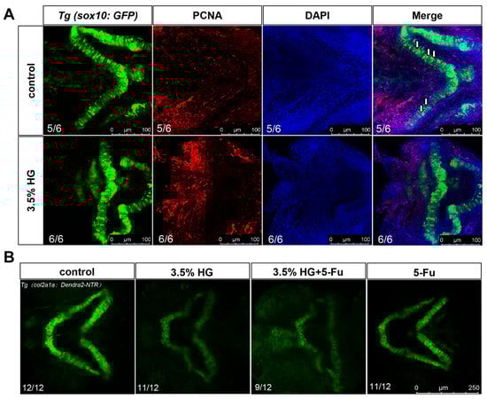 Twenty embryos at 80 hpf were collected and fixed overnight at 4 °C using 4% PFA. The samples were dehydrated three times with methanol (30 min each). Subsequently, the embryos were washed three times with 3% PT (3% Triton X-100 in PBS), 30 min per wash. Acetone pre-chilled to −20 °C was added for overnight permeabilization at −20 °C. Excess acetone was removed by washing with 3% PT, followed by tissue digestion with 200 μL proteinase K at room temperature for 20 min to dissociate epidermal structures. The samples were briefly rinsed twice with 3% PT (1 min each) and post-fixed with 4% PFA for 30 min at room temperature. After removing residual fixative with 3% PT, the embryos were blocked in PBTN (3% PT, 4% bovine serum albumin, 0.02% sodium azide) for 4 h at 4 °C with gentle agitation. Primary antibody incubation was performed by adding 200 μL of antibody solution (200 μL PBTN + 0.4 μL PCNA antibody) per tube overnight at 4 °C. Antibodies were removed by washing five times with 3% PT (45 min each). Secondary antibody (500 μL PBTN + 0.25 μL secondary antibody) was applied under light-protected conditions overnight at 4 °C, with subsequent 3% PT washes. Nuclear counterstaining was performed using 200 μL of PBTN containing DAPI (diluted 1:2000; Roche #10236276001, Basel, Switzerland) for 2 h at room temperature. This was followed by three final rinses with 3% PT prior to confocal imaging, which was conducted using a Leica TCS SP8 laser-scanning confocal microscope (Germany). In the 5-FU co-treatment experiment, embryos were treated with 10 μM 5-FU in conjunction with high glucose exposure from 10 to 80 hpf.