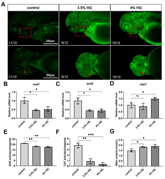High glucose exposure increases oxidative stress in zebrafish embryos at 80 hpf. (A) ROS staining and fluorescence imaging. The boxed area indicates the pharyngeal arch region, with triangular arrows marking ROS accumulation zones in the ceratohyal cartilage (N = 12). Scale bar: 250 μm. (B–D) mRNA relative expression levels of oxidative stress-related genes: sod1, sod2, and nqo1. (E) SOD activity. (F) CAT activity. (G) MDA content. Data are presented as mean ± SEM; ns = not significant, * p < 0.05, ** p < 0.01, *** p < 0.001.
