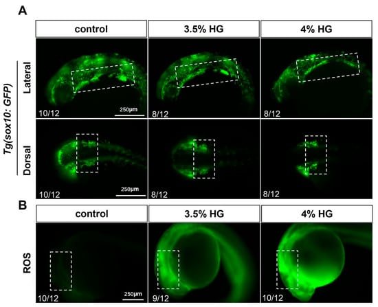Concurrently, oxidative stress may profoundly impair developmental processes by simultaneously reducing cellular proliferation, exacerbating apoptosis, and compromising endogenous antioxidant defense mechanisms. Furthermore, this pathological state promotes mitochondrial dysfunction, facilitates lipid peroxide accumulation, and induces DNA damage in embryonic tissues. These interconnected pathological cascades collectively disrupt normal embryogenesis, culminating in neonatal developmental abnormalities []. Given the high sensitivity of CNCCs to environmental perturbations, these cells are particularly vulnerable to oxidative damage, which may ultimately result in craniofacial malformations [,,]. Therefore, we measured ROS levels at both 24 and 80 hpf. Previous studies have shown that aryl hydrocarbon receptors (AHRs) are key mediators of organic compound-induced oxidative stress, subsequently leading to DNA damage and apoptosis []. In light of these findings, we employed the AHR inhibitor CH223191 and observed a significant reduction in HG-induced craniofacial cartilage malformation in zebrafish embryos. Based on these results, we propose that the craniofacial cartilage malformation induced by HG is likely caused by a mechanism involving oxidative stress. Although the zebrafish embryo model provides distinct advantages for this investigation, several important differences from human fetal development should be acknowledged. Unlike mammalian fetuses that depend on maternal glucose supply, zebrafish embryos initially utilize yolk-derived nutrients []. Additionally, species-specific differences in antioxidant defense mechanisms may influence the results. To fully validate these findings, future studies incorporating complementary mammalian models would be valuable.