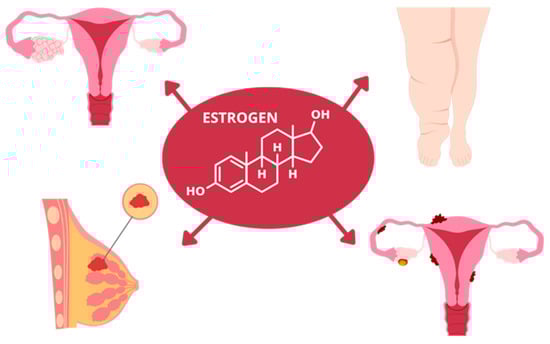 Estrogen is a key hormone involved in numerous physiological and pathological metabolic processes. Beyond its fundamental role in the reproductive system, estrogen also plays a central part in the pathogenesis of several diseases, including endometriosis, adenomyosis, lipedema, polycystic ovary syndrome (PCOS), and breast cancer (Figure 1). These conditions are not typically characterized by altered circulating estrogen levels but rather by estrogen receptor (ER) hyperactivity, which is frequently associated with a significant genetic predisposition [,]. Given their higher prevalence in women, estrogen-dependent disorders usually manifest during periods of hormonal fluctuation such as puberty, pregnancy, and menopause [,,]. Their nonspecific clinical presentation often contributes to underdiagnosis and treatment delays, thereby increasing morbidity and exerting a negative impact on quality of life, mental health, and overall functioning in affected women [].