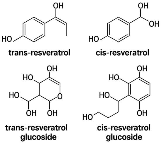 Resveratrol has garnered increasing attention as a promising therapeutic compound for these diseases due to its diverse bioactive properties [], including antioxidant, anti-inflammatory, and estrogen-modulating effects []. Resveratrol is a phenolic stilbene primarily found in plant-based foods, existing in various concentrations and chemical forms, namely cis and trans isomers, which may occur either glycosylated (as glucosides) or in free form (as aglycones), the latter being more bioavailable (Figure 2) [].