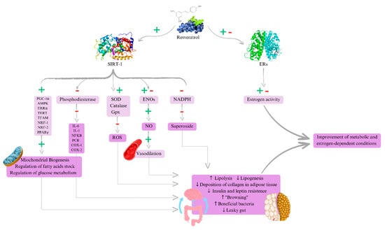 In the case of estrogen-dependent conditions, the main hypothesized action of resveratrol can be summarized in metabolic repercussions. This involves reducing lipogenesis, increasing lipolysis, reducing insulin and leptin resistance, improving adipose tissue fibrosis, promoting the “browning” effect in adipose tissue, improving the gut microbiota pattern and intestinal barrier integrity, contributing to reducing chronic systemic inflammation, and improving the connection of the “gut–brain” axis, which aids in weight loss, ultimately promoting hormone release and regulation by reducing systemic inflammation [,,,,,].