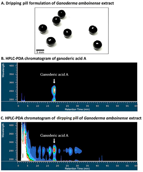 A total of 23 kg of Ganoderma amboinense fruiting bodies were subjected to ethanol extraction using 120 L and 80 L of 95% ethanol at 70 °C for 2 h and 1 h, respectively. The resulting extract was vacuum-concentrated and freeze-dried. The extraction of Ganoderma amboinense fruiting bodies yielded 12.4% (w/w) dried extract. One kg of the dried extract was subsequently blended with polyethylene glycol 4000 (1:1, w/w) and supplemented with 20% (w/w) red quinoa (Chenopodium formosanum) phenolic extract as a stabilizing excipient. The mixture was then heated to 70 °C, passed through a 20-mesh sieve, and molded into sublingual dripping pills. This pilot-scale process yielded 2.3 kg of dripping pill formulation (GDP) (Figure 1A). The chemical identity and purity of ganoderic acid A within the final GDP product were verified by high-performance liquid chromatography with photodiode array detection (HPLC-PDA). As illustrated in Figure 1B,C, both the reference standard ganoderic acid A and the GDP sample exhibited a well-resolved peak at approximately 17.5 min, with consistent UV absorbance spectra spanning 200–400 nm. These findings confirm the retention and integrity of ganoderic acid A within the formulated dripping pills, despite the presence of other co-extracted compounds. Quantitative HPLC analysis further revealed that the final GDP product contained 2.935 mg/g of ganoderic acid A. The application of PDA detection not only ensured accurate chromatographic identification but also provided spectral fingerprinting for compound verification, highlighting the robustness of the formulation process in preserving triterpenoid bioactivity. In addition, HPLC analysis confirmed the presence of rutin derived from the red quinoa phenolic extract, with a quantified content of 220 mg/kg in the final GDP product. The formulated GDP was a uniform, spherical solid dosage form with a diameter of approximately 3.0 mm and a mean weight of 30 mg. The surface was smooth and dark brown in color, with no visible cracks or deformation. These characteristics support reproducibility and quality assessment of the formulation.