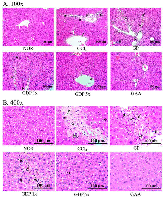 Histopathological evaluation of liver sections from CCl4-induced fibrotic mice following treatment with Ganoderma amboinense formulations. (A) Low-power (100×) and (B) high-power (400×) photomicrographs of hematoxylin and eosin-stained liver sections. Mice received intraperitoneal injections of olive oil (NOR) or CCl4 (0.4 µL/g) three times weekly for six weeks. Treatment groups (n = 7) were administered G. amboinense powder (GP; 410 mg/kg/day), sublingual dripping pills of G. amboinense fruiting body extract at 92.25 mg/kg/day (GDP 1×) or 461.25 mg/kg/day (GDP 5×), or purified ganoderic acid A (GAA; 1.07 mg/kg/day). Black arrows highlight hepatocellular necrosis, inflammatory cell infiltration, and disruption of hepatic cords. Scale bars = 100 µm.