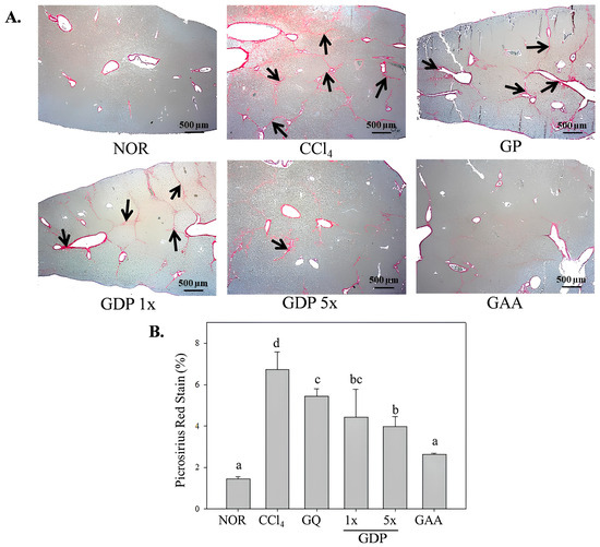 Hematoxylin and eosin staining (Figure 2) revealed that CCl4-induced disorganized hepatocyte architecture, cell membrane disruption, and nuclear shrinkage with focal necrosis. Treatment with GDP 5× and GAA substantially ameliorated these histopathological changes, restoring near-normal cellular morphology; GDP 1× provided partial protection, whereas GP showed minimal improvement. Picrosirius red staining (Figure 3) demonstrated extensive collagen deposition in the CCl4 group (p < 0.05 vs. NOR). Both GDP 5× and GAA treatments significantly reduced fibrotic area by approximately 60% (p < 0.05 vs. CCl4), with no significant difference between them; GDP 1× also reduced fibrosis significantly relative to GP (p < 0.05).
