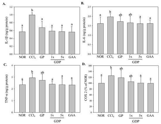 CCl4 markedly upregulated hepatic IL-1β, IL-6, and TNF-α levels versus NOR (p < 0.05; Figure 4). GDP (1×, 5×) and GAA each normalized IL-1β to near-baseline levels (p < 0.05 vs. CCl4). IL-6 and TNF-α were significantly suppressed by GDP 5× and GAA (p < 0.05), while GDP 1× and GP displayed only non-significant trends. COX-2 expression was significantly reduced by GDP 5× and GAA (p < 0.05), with other groups showing downward trends (Figure 5).