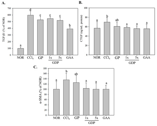 Inhibition of hepatic profibrotic marker expression in CCl4-induced fibrotic mice treated with Ganoderma amboinense formulations. (A) Transforming growth factor-β1 (TGF-β1) levels expressed as a percentage of the NOR control; (B) connective tissue growth factor (CTGF) concentration in ng/mL per g protein; (C) α-smooth muscle actin (α-SMA) expression expressed as a percentage of the NOR control. Mice received intraperitoneal injections of olive oil (NOR) or CCl4 (0.4 µL/g) three times weekly for six weeks. Treatment groups (n = 7) were administered G. amboinense powder (GP; 410 mg/kg/day), sublingual dripping pills of G. amboinense fruiting body extract at 92.25 mg/kg/day (GDP 1×) or 461.25 mg/kg/day (GDP 5×), or purified ganoderic acid A (GAA; 1.07 mg/kg/day). Data are presented as mean ± SD (n = 7). Different letters indicate significantly different values according to a one-way ANOVA using Duncan’s multiple test (p < 0.05).