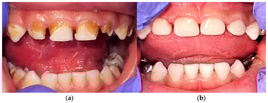 Dental complications and restorative management in DS-ALL. (a) Intraoral presentation after induction chemotherapy, showing extensive structural and chromatic alterations of the deciduous dentition, including pronounced enamel hypoplasia, generalized discoloration, and multiple carious lesions, in the context of DS and prior systemic chemotherapy; (b) post-treatment restorative reconstruction of the affected teeth using composite resin fillings and prefabricated pediatric crowns, aimed at restoring function and aesthetics, while minimizing the risk of odontogenic infections. Abbreviations: DS—Down syndrome; ALL—acute lymphoblastic leukemia.