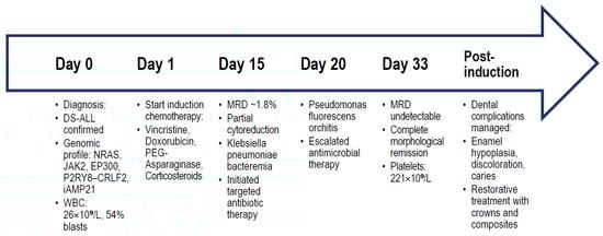 Timeline summarizing the patient’s diagnostic work-up, genomic findings, induction chemotherapy course with MRD assessments, infectious complications, and dental management. The diagram integrates (i) initial diagnosis and baseline laboratory values, (ii) genomic and cytogenetic alterations identified by NGS and karyotyping, (iii) induction chemotherapy timeline with MRD assessments, (iv) infectious complications and their targeted antimicrobial management, and (v) dental pathology development and restorative interventions. Abbreviations: DS—Down syndrome; ALL—acute lymphoblastic leukemia; WBC—white blood cell count; NGS—next-generation sequencing; MRD—minimal residual disease; PDA—patent ductus arteriosus.