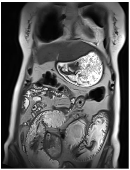 The patient underwent multiple gastroenterological evaluations at different healthcare centres for progressive signs of intestinal obstruction. An entero-MRI was performed, revealing a circumferential, mildly asymmetric, and relatively short segment of thickening at a jejunal loop. This lesion caused significant upstream dilation of the proximal jejunal loops, with a maximal diameter of 5 cm—findings consistent with high-grade intestinal obstruction due to a tight stricture at the jejunal level. No local or distant metastases were identified at that time (Figure 1).