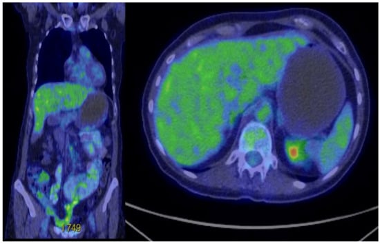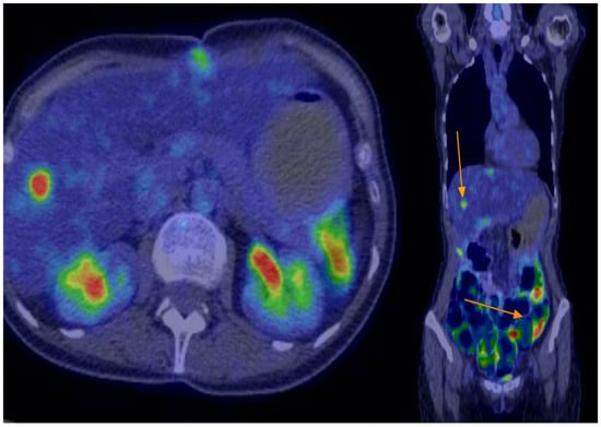 Treatment was initiated with nivolumab 480 mg every 4 weeks and cabozantinib 40 mg daily. This regimen was maintained for the first three months, with scheduled imaging assessments—including PET-CT and hepatic MRI—at 3 to 4 months to evaluate both structural changes and metabolic activity of liver and residual peritoneal metastases. Monthly clinical and laboratory follow-up was performed, during which the patient showed good treatment tolerance without adverse events. Follow-up imaging at 3 and 6 months demonstrated no disease progression on PET-CT or hepatic MRI. At the 9-month evaluation, liver MRI identified three new small lesions (measuring 5–8 mm). Two of these showed slight dimensional progression, while one showed regression compared to the previous scan. According to RECIST 1.1 criteria, the overall assessment remained consistent with stable disease. To further evaluate metabolic activity, an additional PET-CT was performed (see Figure 4). It revealed multiple nodular and flat lesions located along the anterior peritoneal surface of segments III, IV, VI, and VIII (SUV max up to 6.66; largest lesion 5.3 × 1.3 cm), as well as intraparenchymal lesions in segment V (SUV max 4.62) and segment VI (1.5 × 1.3 cm, SUV max 9.22). On PET-CT prior to treatment, the hepatic lesion had an SUVmax of 12.4, which decreased to 5.2 at 6 months and remained stable at 18 months. The maximum SUV of the largest peritoneal nodule decreased from 11.5 to 7.3 cm. These findings supported the clinical observation of durable disease control. Despite these findings, the disease remained classified as stable.