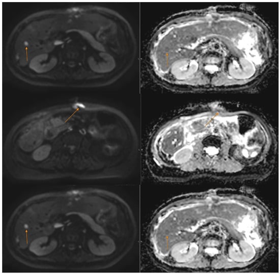 At the time of consultation in our department, the patient’s general health status and biological parameters were excellent. Although the surgery had cytoreductive intent, the postoperative MRI detected residual disease (peri centimetric peritoneal and hepatic metastases)—confirmed by postoperative MRI (see Figure 3). T2W heterogeneous lesions displaying restricted diffusion are observed. These lesions measure 18 × 14 mm on peritoneal surface at the level of liver segments 8–4, 22 × 8 mm and 25 × 10 mm adjacent to each other at the level of segment 2 and 20 × 9 mm adjacent to surgical site on peritoneal surface at the level of segment 6. The patient had a good performance status, no comorbidities, and no contraindications to combined immune-targeted therapy. After multidisciplinary discussion, we opted for treatment with a MET kinase inhibitor (cabozantinib) in combination with a PD-1 checkpoint inhibitor, based on its more favourable safety profile compared to other VEGFR inhibitors such as pazopanib or sunitinib [21]. Furthermore, the NGS panel from the cytoreductive surgery identified PD-L1 expression at 15% TPS, with variants of unknown significance (VUS) in MYC, EWSR1, and STAG2. Given the patient’s prior intolerance and lack of benefit from chemotherapy, first-line targeted therapy combined with immunotherapy was considered a rational and potentially more effective therapeutic option. The combination of cabozantinib, a multi-target tyrosine kinase inhibitor with activity against MET, VEGFR, and AXL, and nivolumab, an immune checkpoint inhibitor targeting PD-1, was selected based on their potential synergistic effect. Cabozantinib may enhance antitumor immunity by modifying the tumour microenvironment, reducing immunosuppressive signalling, and promoting T-cell infiltration, thereby potentiating the efficacy of PD-1 blockade. Although prospective evidence in GNET/CCS is lacking, emerging data in other sarcomas and rare tumours support this strategy as a rational approach in the absence of standard treatment options.
