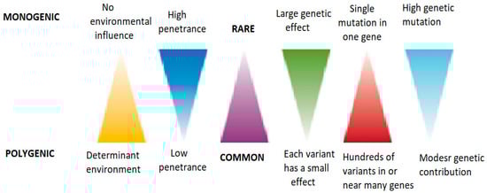 The complexity of human obesity is emphasized by the extensive number of genetic loci contributing to common forms. Figure 1 compares the monogenic and polygenic obesity regarding genetic influence, mutation type, and environmental contribution [].