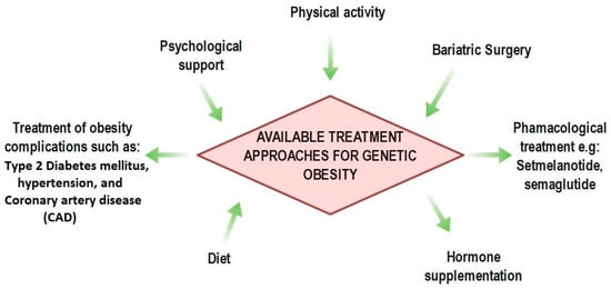 Gaining insight into syndromic obesity improves our understanding of the important hormonal and neuroendocrine systems that control energy balance. These understandings are essential for both guiding customized treatments and early diagnosis. Current treatment approaches for congenital and genetically induced obesity include surgical, pharmaceutical, and lifestyle treatments, emphasizing the multifaceted character of care [,]. Figure 2 illustrates these diverse therapeutic approaches.