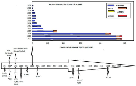 An overview of the key milestones and population-specific discoveries in obesity genetics is illustrated in Figure 3. The lower panel shows essential events from 1994 to 2020, starting with the cloning of the leptin [LEP] gene and moving on to the discovery of critical candidate genes [such as LEPR, MC4R, POMC, BDNF, SH2B1, and ADCY3] through both candidate gene and genome-wide linkage studies. The upper panel shows the number of obesity-related loci found by genome-wide association studies [GWAS] from 2007 to 2020. The contributions are broken down by ancestry [European, Asian, African, and Other]. The graph shows a massive rise in discovered loci, mostly from European populations. This indicates that we are learning more about the genetic architecture of obesity and that genetic studies need to include more diverse ancestral groups.