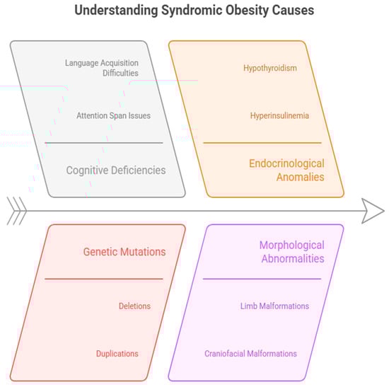 The figure above gives a complete description of the multiple causes of syndromic obesity. It divides contributing factors into four categories: cognitive deficiencies, such as attention span issues and language acquisition difficulties; genetic mutations, such as deletions, duplications, and point mutations; endocrinological anomalies, including hyperinsulinemia and hypothyroidism; and morphological abnormalities, such as limb and craniofacial malformations. Together, these interrelated elements highlight the intricacy of syndromic obesity and the several molecular mechanisms that influence its development [].