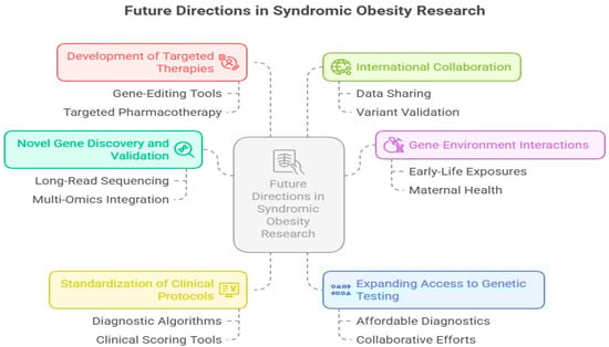 Future directions in syndromic obesity research focus on targeted therapies, gene discovery, international collaboration, and gene–environment interactions. Efforts also include standardizing clinical protocols and expanding access to affordable genetic testing.